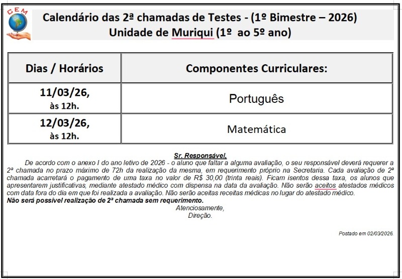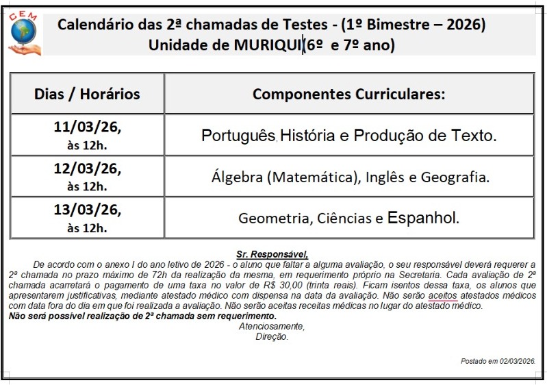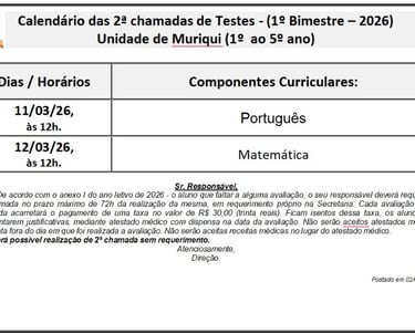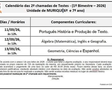 2ª chamadas de Testes - (1º Bimestre – 2026) Unidade de Muriqui