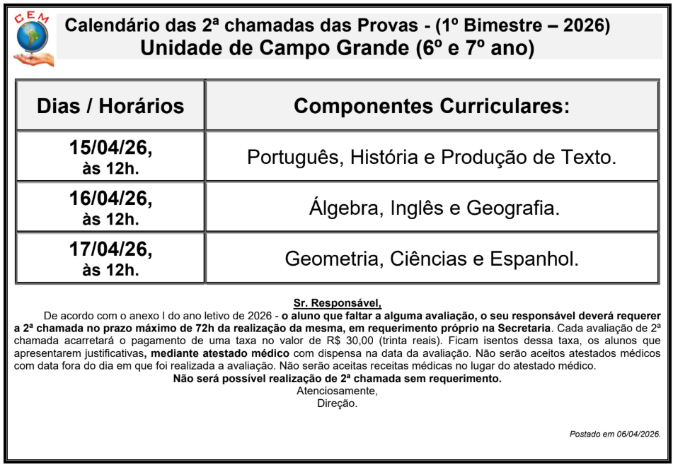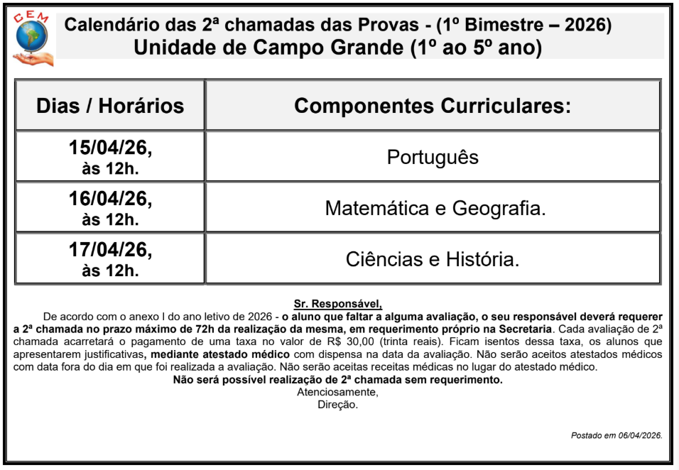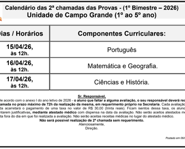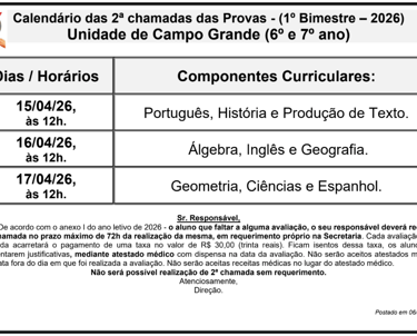 Calendário das 2ª Chamada das Provas