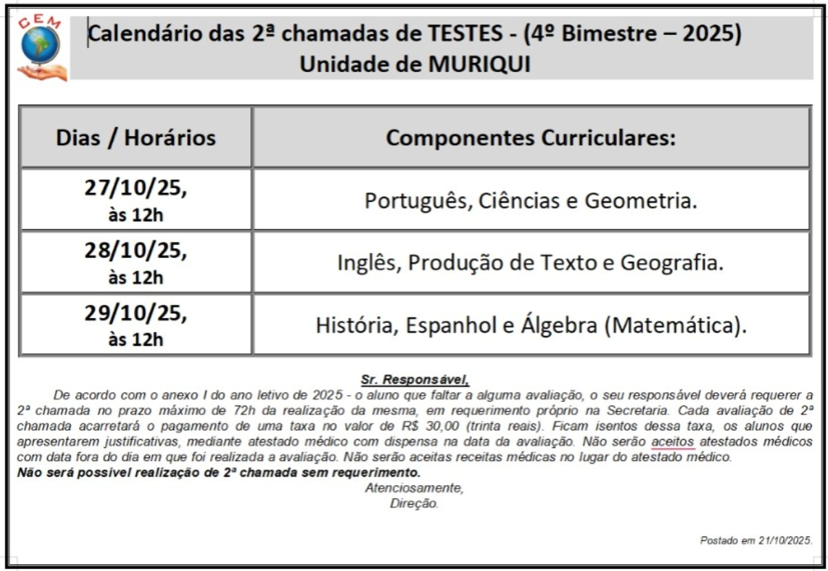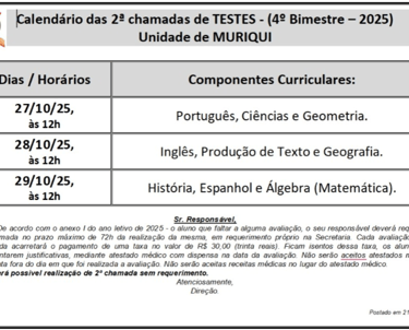 2ª Chamada de Testes – (4º Bimestre – 2025)